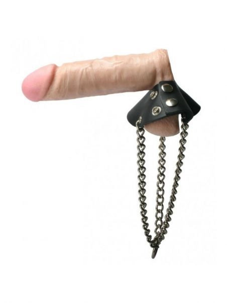 Pour les amateurs du travail des couilles, ce ballstretcher parachute permettra de les isoler solidement gru00e2ce u00e0 son cercle en cuir de haute qualitu00e9 et ses boutons pression. Dotu00e9 de plusieurs chau00eenes, vous pourrez y accrocher le poids de votre choix (non fourni).