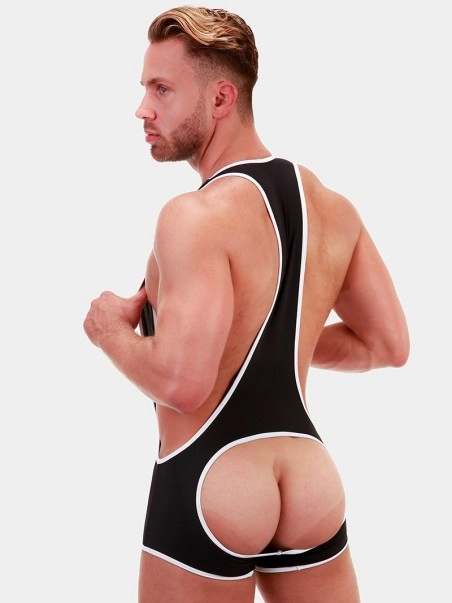 La coupe elle, est très échancrée et très sexy. Côté face les longues bretelles affinent la silhouette et plonge dans un shorty minimaliste assorti d’une poche confortable à effet gros paquet. Côté pile, le body très échancré laisse une large part de visibilité aux dorsaux, et c’est tant mieux, et se complète par une belle ouverture pour les fessiers.