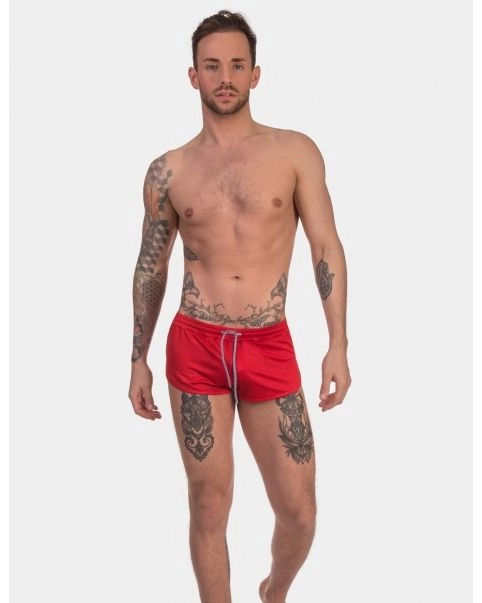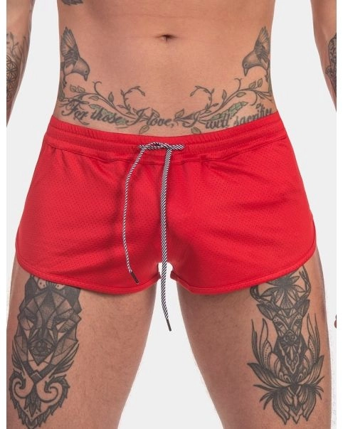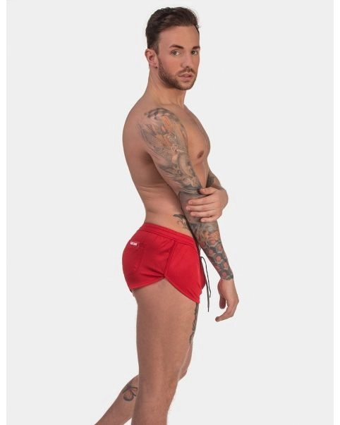 Le short taille basse est u00e9quipu00e9 d’une ceinture u00e9lastique avec cordon de serrage, d’une poche plaquu00e9e u00e0 l’arriu00e8re avec l’u00e9tiquette surpiquu00e9e de la marque de vu00eatements gay. Il est fait dans tissu doux et respirant pour la peau.