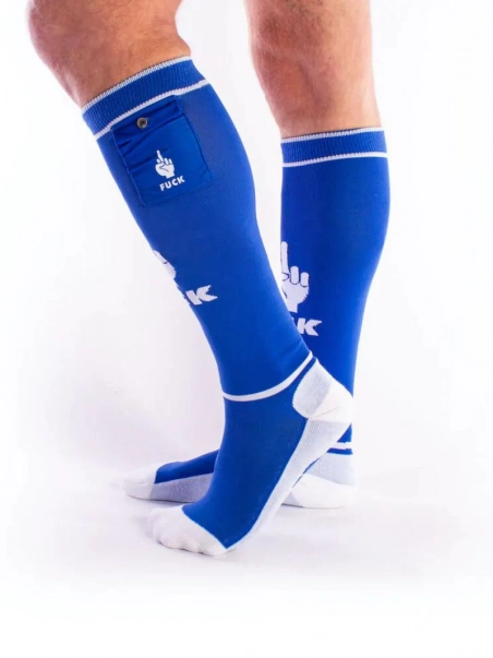 Complu00e9tez votre look sportswear et/ou puppy avec ces chaussettes hautes au message plutu00f4t clair. Elles disposent u00e9galement de deux petites poches tru00e8s pratiques en soiru00e9e.