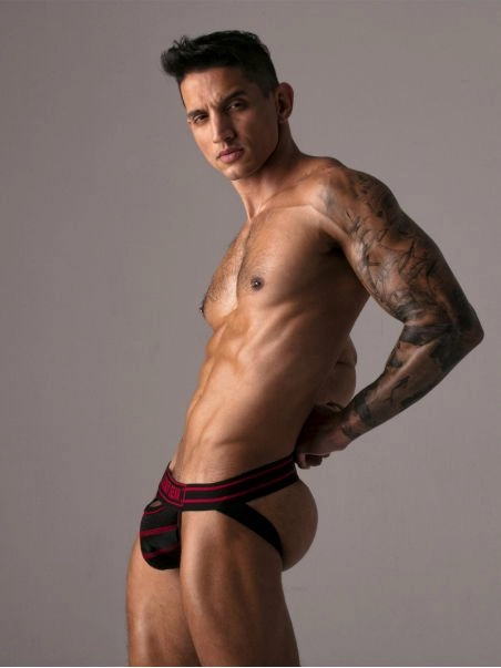 Le jockstrap se du00e9cline en trois couleurs : noir avec des surpiqu00fbres rouges, blanches ou bleues.