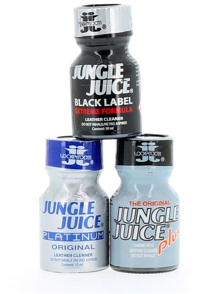 Lot de 3 petits poppers au nitrite de Pentyle. Ce sont les poppers les plus vendus au monde. La molu00e9cule est douce et puissante. Le lot est composu00e9 des poppers Jungle Juice Plus, Jungle Juice Black Label, et Jungle Juice Platinum.