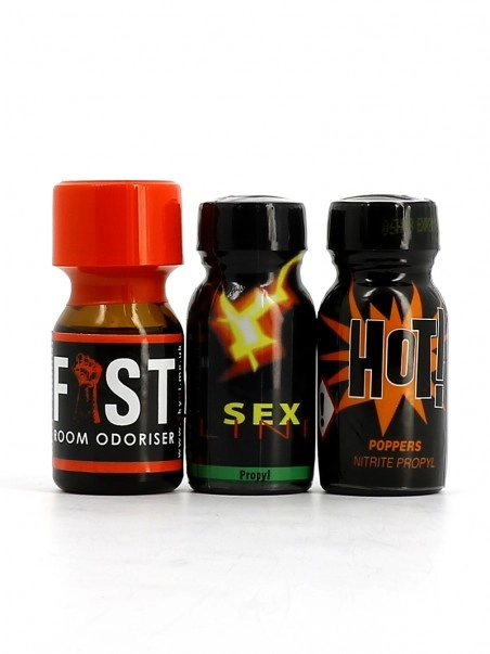 Lot de 3u00a0petits poppers au nitrite de Propyle. Particuliu00e8rement adaptu00e9 au du00e9butant, la formule utilisu00e9e depuis les annu00e9es 80 u00e0 fait ses preuves. Le lot est composu00e9 de poppers Fist, Sexlineu00a0Propyle, et Hot.