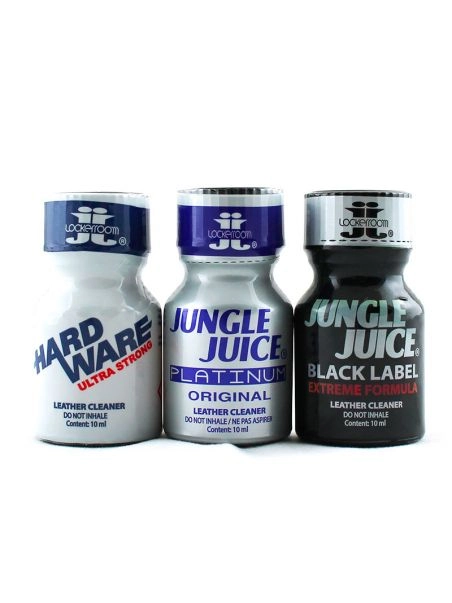Lot du00e9couverte Best seller : 3 petits flacons de poppers ultra fort (nitrite de pentyle). Jungle Juice Black Label + Hard Ware + Jungle Juice Platinum. Parfum standard. Lot de 3 flacons de 10 ml.