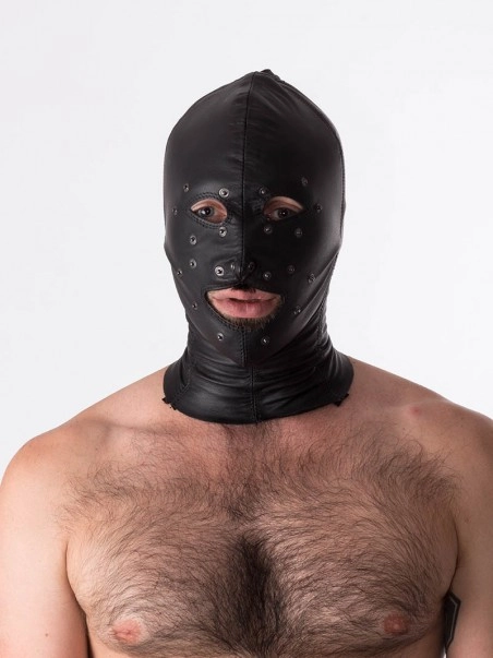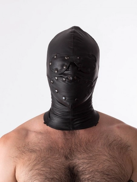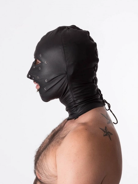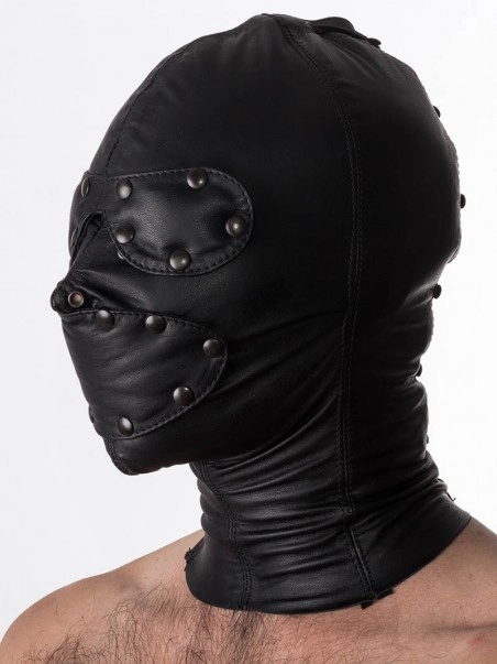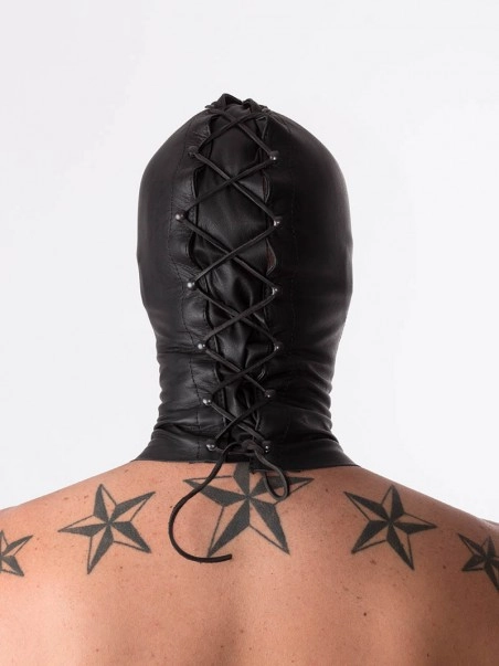 Cagoule ru00e9alisu00e9e en cuir souple. Ajustement par lacet u00e0 l’arriu00e8re. Cache yeux et cache bouche du00e9tachable par pressions.Taille S u00e0 XL