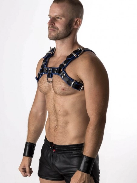 Du00e9clinaison de notre cu00e9lu00e8bre harnais Pitbull en cuir noir souple, ce harnais de poitrine est bordu00e9e d’une laniu00e8re en cuir bleue, doublu00e9e d’une laniu00e8reu00a0enu00a0cuir noir lu00e9gu00e8rementu00a0plus u00e9troite. Les deux u00e9lu00e9ments sont cousus et l’ensemble est rivetu00e9.u00a0