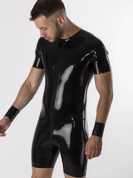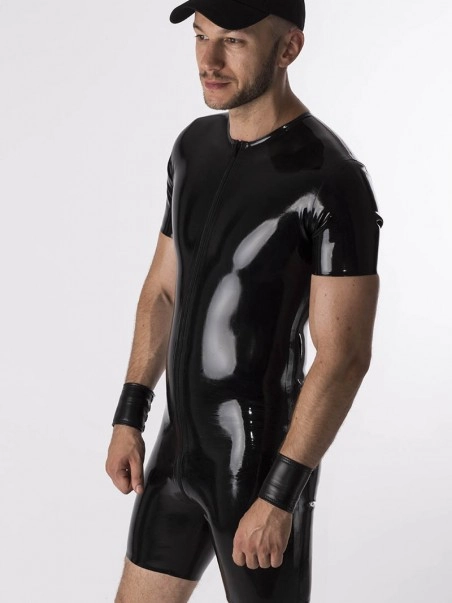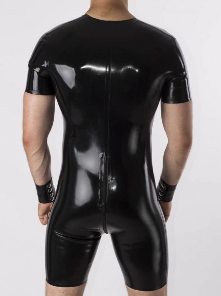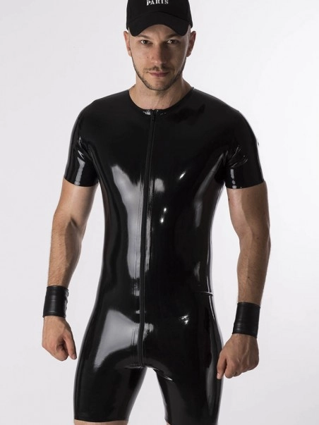 Nous avons ru00e9uni le tee shirt et le short pour faire de cette combinaison moulante en latex noir (ep :u00a00.60mm) un vu00eatement fetish pratique.u00a0