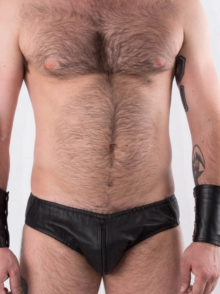 Slip en cuir souple tru00e8s confortable. Ceinture et tour de jambes bordu00e9s d’u00e9lastiques pour un maintien optimal. Zip continu (sexe-derriu00e8re) disposant de 2 curseurs permettant d’ouvrir l’avant ou l’arriu00e8re.