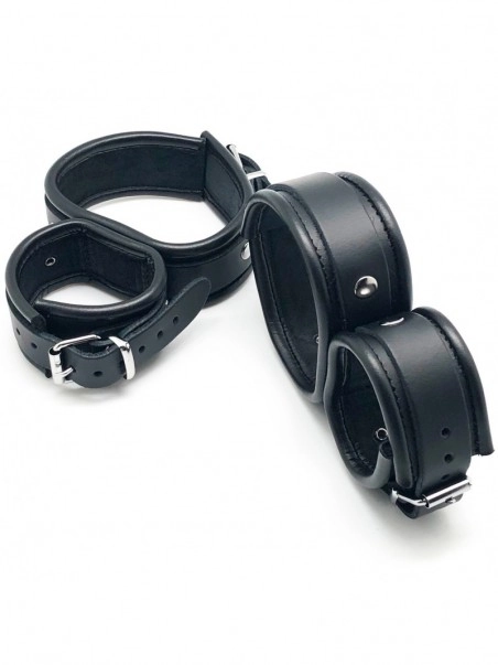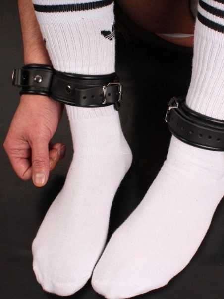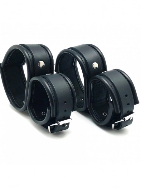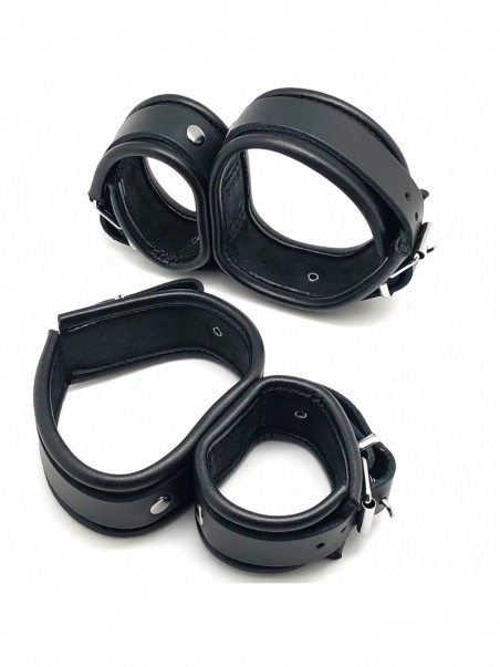 Pratiquer un jeu de ru00f4le dominant et dominu00e9 nu00e9cessite du matu00e9riel pour le BDSM. Notre u00e9quipement ru00e9pond u00e0 cette attente. Avec cette double paire de menottes en cuir poignets et chevilles la contrainte est forte puisque le soumis est complu00e8tement entravu00e9, privu00e9 de sa libertu00e9.
